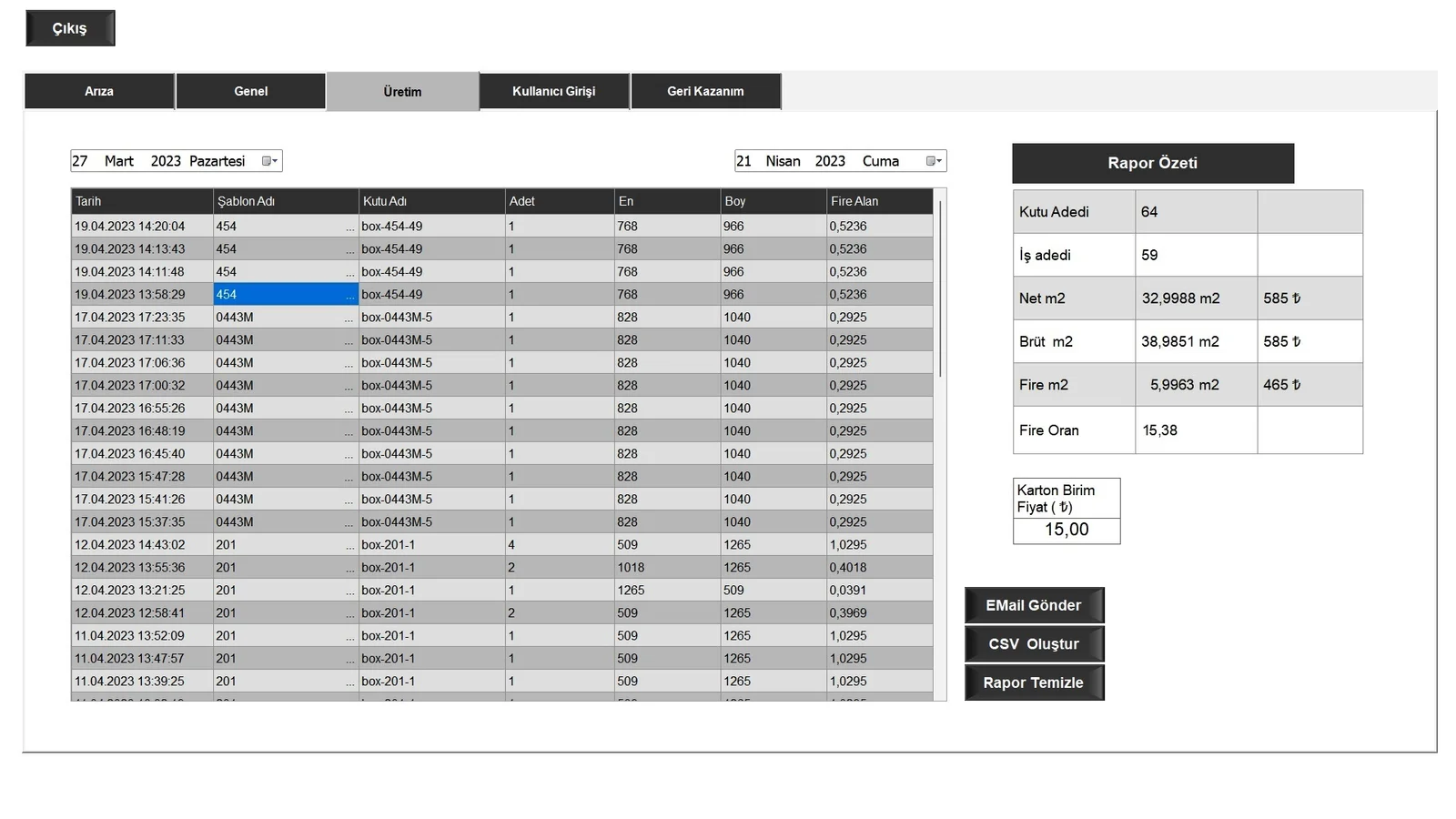 - Detailed cardboard cost calculation with the amount of square meters produced and wastage